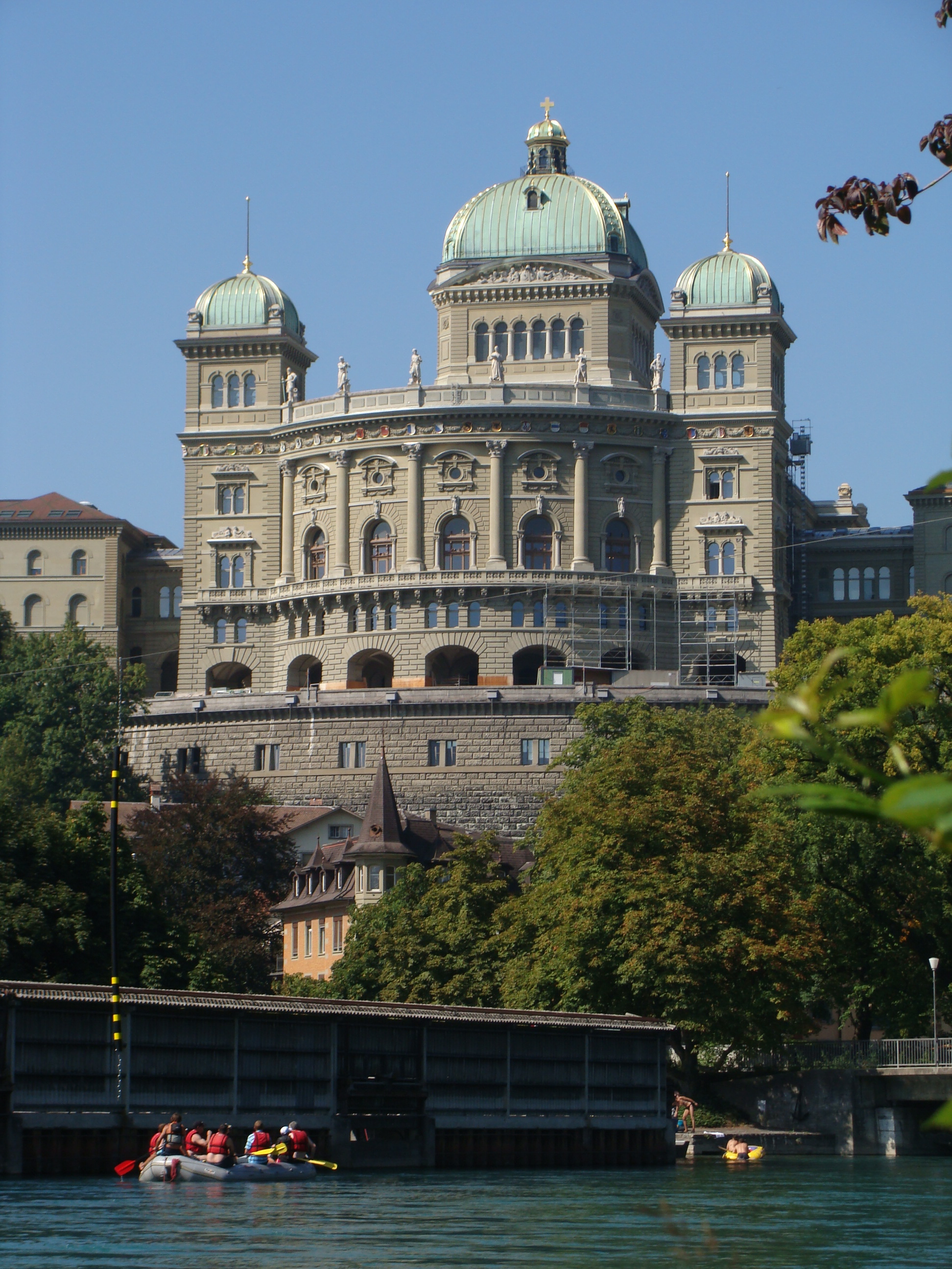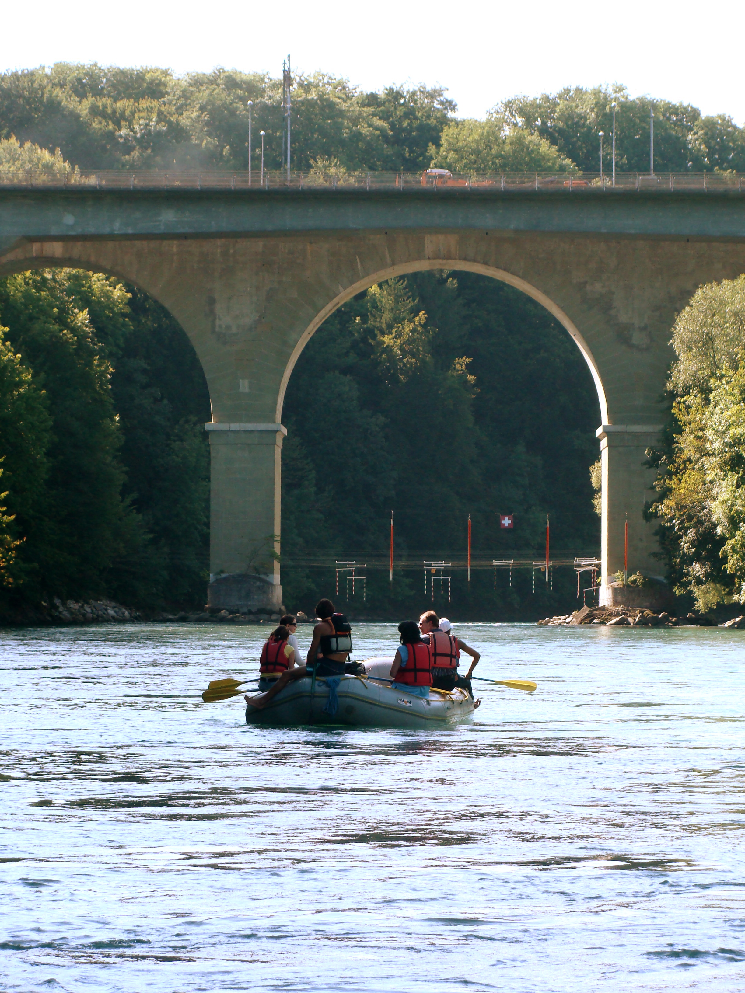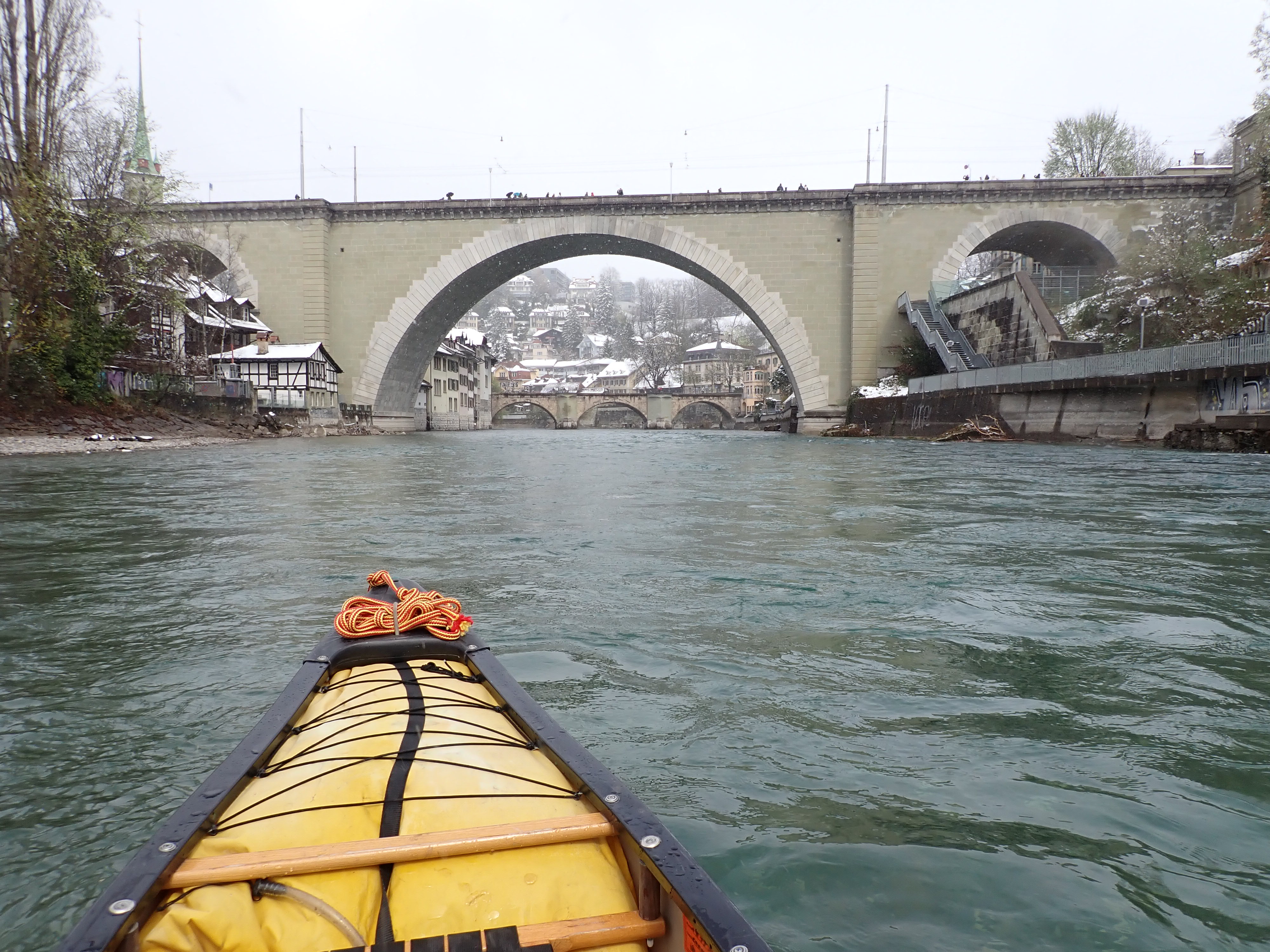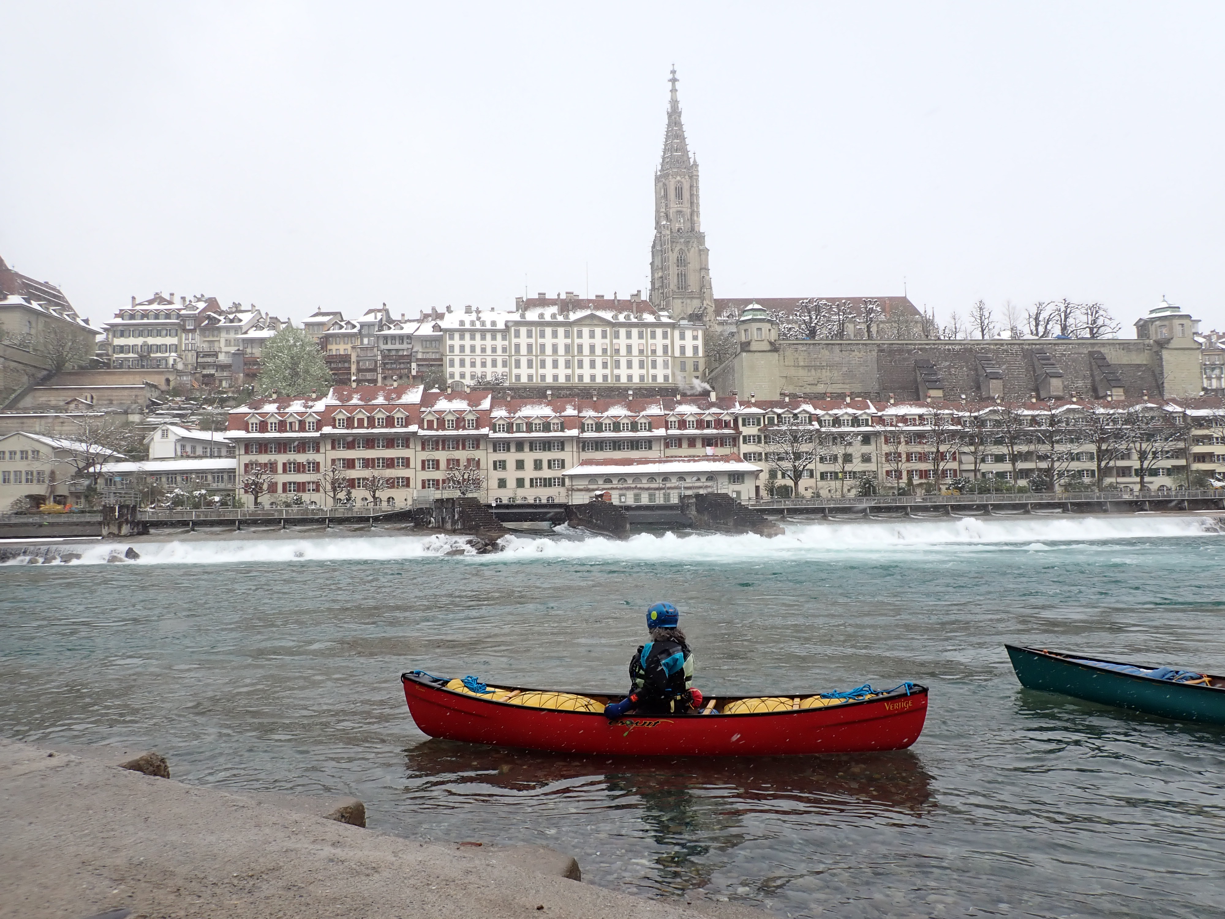 Kurz nach Rubigen kommt die Strecke auf der Aare, wo es am meisten Sporen (seitliche Flussverbauungen) gibt. Ein ideales Spielfeld für offene Kanadier, Kehrwasser rein und raus und meistens einige super Surfwellen, das macht so richtig Spass. Touristisch gesehen ist die Strecke aber auch äusserst attraktiv. Die Einfahrt in Bern, mit Blick aufs Bundeshaus, das Schwellenmätteliwehr mit dem Münster im Hintergrund, und weiter um die Altstadt, vorbei am Bärenpark bis zum Lorrainewehr. Ab hier kehrt dann Ruhe und Frieden ein, die meisten Aareböötler befahren nur die obere Strecke. Nach den ersten Aareschlaufen. Erreichen wir Worblaufen, wo noch einmal eine super Spielstelle auf uns wartet, die legendäre Worblaufenwelle, unser Trainingsort von Montagabend. Wer noch genug Energie besitzt, kann die hier noch ohne Probleme loswerden.