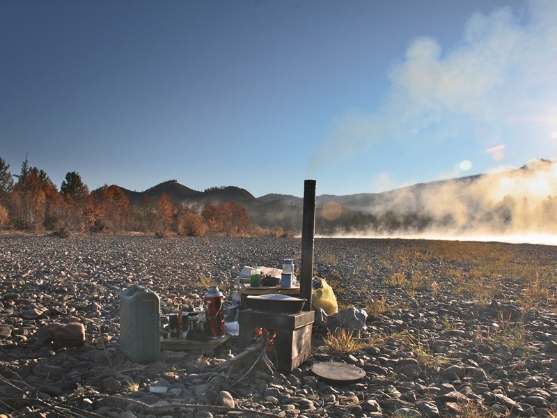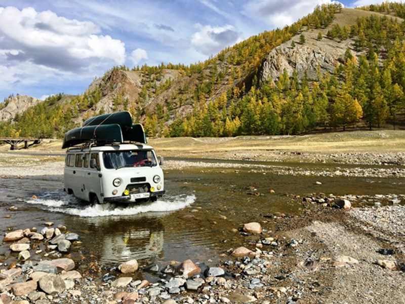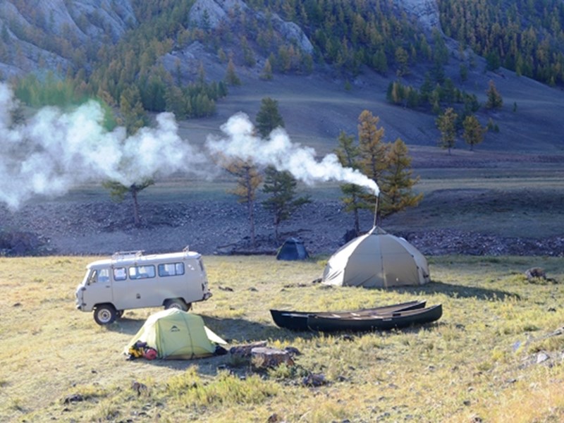 Unser Startpunkt für die lange Kanutour ist der Zusammenfluss des Delgers und des kleinen Flusses Beltes. Einmal auf dem Fluss gibt es nun kein Zurück mehr, denn die nächsten rund 100 Flusskilometer sind eine extrem abgelegene Gebirgswildnis, zu der es keinen Zugang per Auto gibt. Selbst Nomaden gibt es hier, am Oberlauf des Flusses, praktisch keine. Das bedeutet, wir sind für die nächsten fünf Tage auf uns selbst gestellt. Erst eineinhalb Paddeltage vor dem kleinen, abgelegenen Steppenörtchen Burentogtokh gäbe es wieder einen – sehr abenteuerlichen! – punktuellen Zugang für unseren guten alten UAZ-452 „Furgon“, den legendären russischen Allradbus, der in seiner Heimat liebevoll „Bukhanka“ – Kastenbrot – genannt wird…