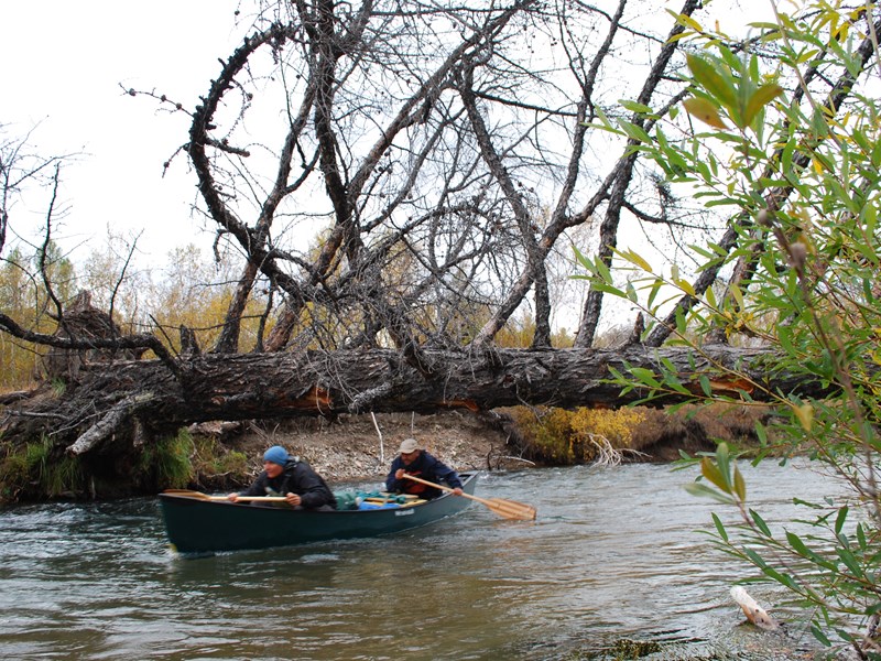 Hinter Burentogtokh öffnet sich das Delgertal und der Fluss mäandert nun, etwas langsamer, durch eine breite, flache Steppenlandschaft, die in der Ferne umrahmt wird von harschen, zerklüfteten Felsen auf der Nordseite und grossen Lärchenwäldern an den sanften Hängen im Süden. Der Charakter des hier beginnenden Mittellaufes ist völlig anders: Alles ist plötzlich flach, weit, offen und karg – nur die Ufer sind nun teils dicht bewachsen mit Weidenbüschen und Pappeln. An vielen Stellen teilt sich der Fluss in diverse kleine und enge Seitenarme, deren Befahrung manchmal etwas Navigationskunst verlangt. Dann, nach ungefähr insgesamt sieben Paddeltagen, stehen wir plötzlich am kleinen Strand von Esees und Möögiis Jurtencamp, dem Ausgangspunkt unserer Reise. Natürlich übernachten wir hier und geniessen den Luxus einer heissen Dusche und ein gutes Abendessen in Möögiis gemütlicher Gaststube, bevor es dann am nächsten Tag, ausgeruht und mit neuer Kraft und frischen Vorräten, weitergeht – immer noch durch das breite Steppental von Mörön, vorbei an der Provinzhauptstadt.