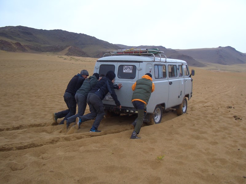 Wenige Kilometer vor dem Ende unserer Tour, am Anfang des „Fünfflusstals“ wartet noch ein kleines Highlight auf uns: Direkt neben dem Fluss taucht plötzlich eine imposante Sanddüne auf! Fast kommt hier, obwohl wir immer noch weit im Norden der Mongolei sind, etwas „Wüsten-Feeling“ auf. Nach einem kleinen Picknick an der Düne paddeln wir weiter, lassen die Tour ganz gemütlich ausklingen. Wenn sich wenig später der Delger mit dem Ider zur grossen Selenge vereint, wird es Zeit Abschied von unserem Fluss zu nehmen. Dies wird allerdings nicht allzu melancholisch werden, denn gleichzeitig feiern wir das Wiedersehen mit unserem Fahrer! Wir laden Boote und Ausrüstung auf bzw. in den Bus und machen uns auf die dreitägige Heimreise ins ferne Ulaanbaatar. Noch einmal geht es durch entlegene und tief beeindruckende Landschaften, über die Nordhänge des Khangai-Gebirges hinab ins Idertal und von dort aus weiter durch riesige, einsame Lärchenwälder, bis wir am grossen „Weissen See“ und dem Khorgo Nationalpark ankommen. Ab hier geht es erstmals auf geteerter Landstrasse weiter durch die Steppe, Richtung Karakorum (Kharkhorin), der alten Hauptstadt des einstigen mongolischen Riesenreiches. Hier besuchen wir das uralte buddhistische Kloster Erdene Züü, in dessen mit 108 weissen Stupas versehenen Mauern mehrere wunderschöne Tempel und ein Museum beherbergt sind.