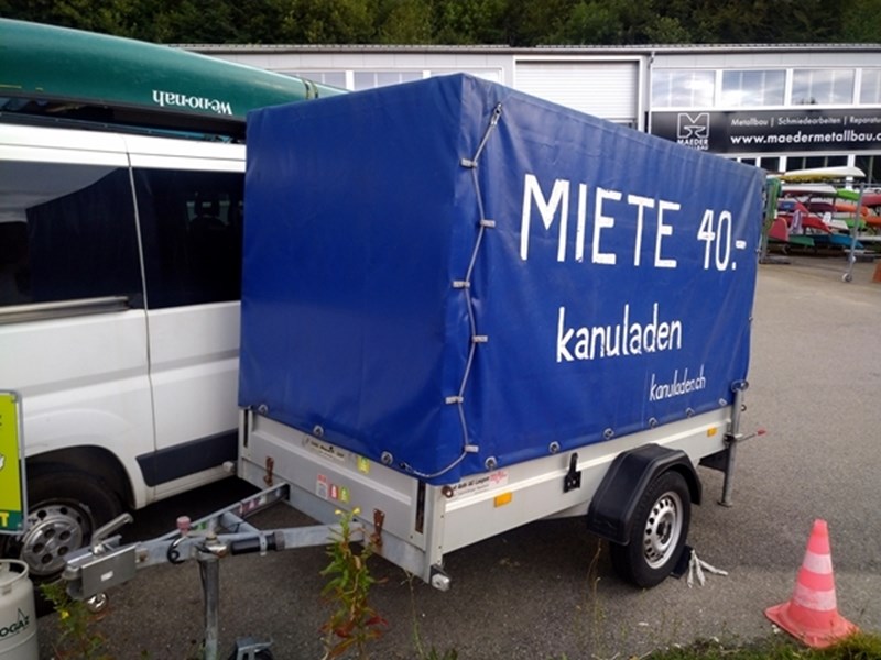 Wir vermieten unseren kleinen Transport-Anhänger mit blauer Plane. Ideal für Umzüge und Transporte von grossen Sachen.